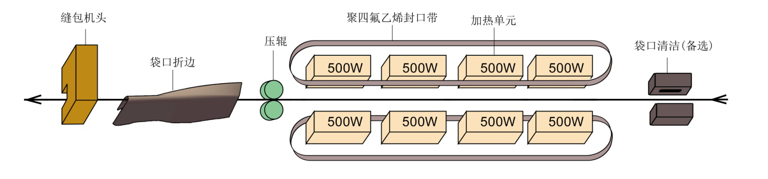熱封縫合工作流程:袋口清潔(備選)→內袋熱封(4組加熱塊加熱:聚四氟乙烯封口帶使加熱塊與袋子不直接接觸,以保護袋子外表不與加熱塊粘連)→壓輥壓合→袋口折邊→縫包機:外袋縫紉